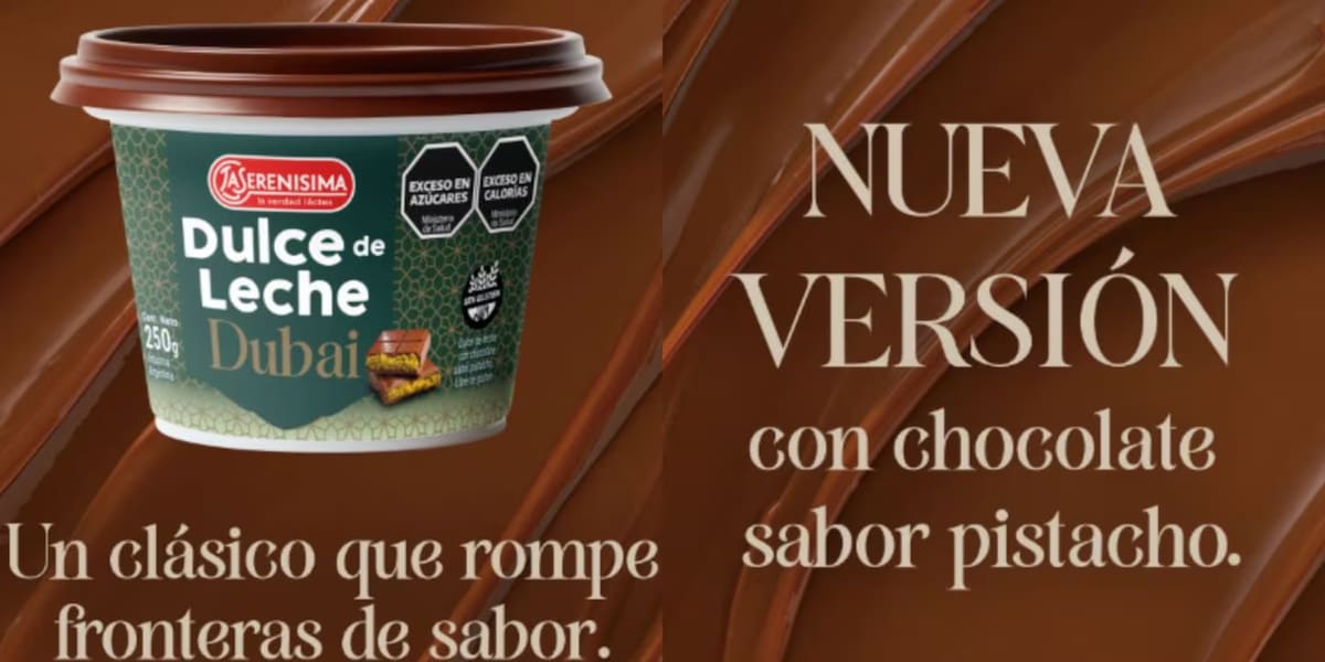 “Nuestro clásico argentino, el que se unta, se cucharea y se disfruta, tiene una nueva versión, con chocolate sabor pistacho. Rompemos las fronteras del sabor con el nuevo Dulce de Leche Dubai”, escribió la Serenísima en un posteo de Instagram.