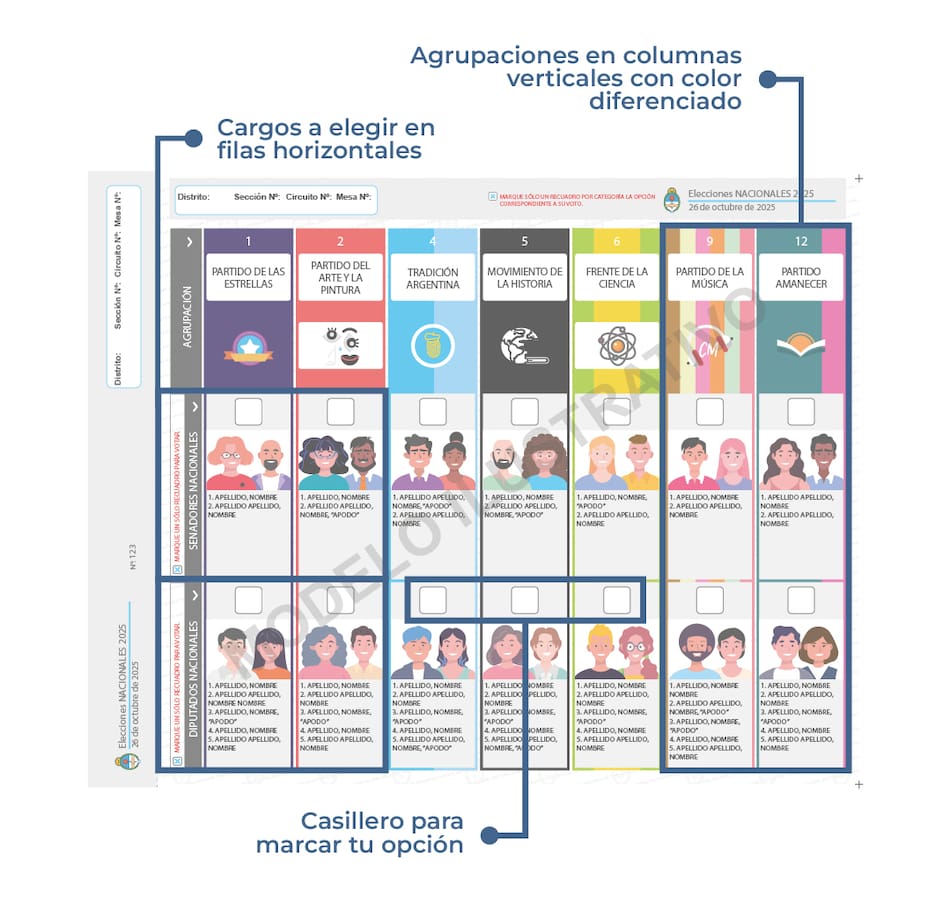 Una vez en la cabina de votación, vas a ver que la boleta tiene las listas de cada fuerza política separadas en columnas verticales y cada categoría de cargos separadas en filas horizontales. Marcá con la lapicera, la que trajiste o la que te dieron en la mesa, la opción de tu preferencia en el recuadro correspondiente. Pero ojo, solo podés marcar una lista por categoría.