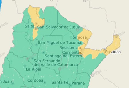 En el área señalada en amarillo, que comprende zonas de Formosa, Chaco, Misiones, Corrientes, Salta y Jujuy, se prevén tormentas con lluvias intensas, actividad eléctrica y ráfagas de viento que podrían alcanzar los 90 km/h.