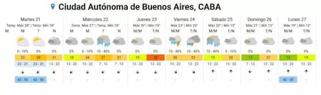 - Viernes 24: tormenta con actividad eléctrica y ráfagas de viento. Temperaturas de hasta 23°.