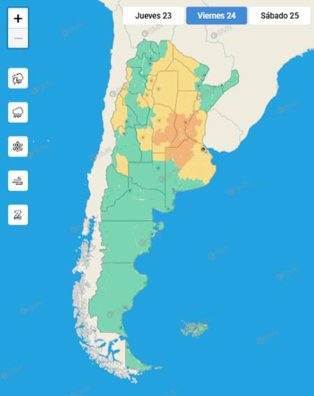 - Viernes 24: máxima de 23 grados, mínima de 18, con tormentas fuertes durante la madrugada y la mañana, que pasarán a ser aisladas a la tarde y chaparrones a la noche.
