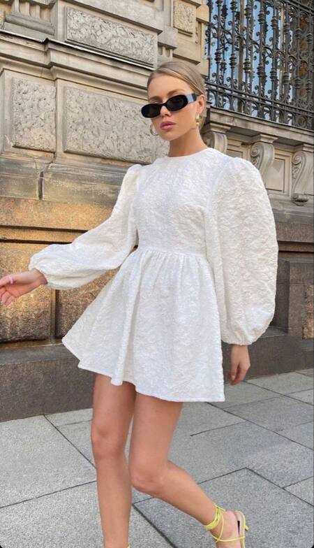 Para quienes prefieren un estilo más descontracturado, pero con mucha presencia, este look combina un vestido midi en tono beige claro o blanco roto, de lino o algodón, con una caída fluida y liviana, ideal para una noche cálida.