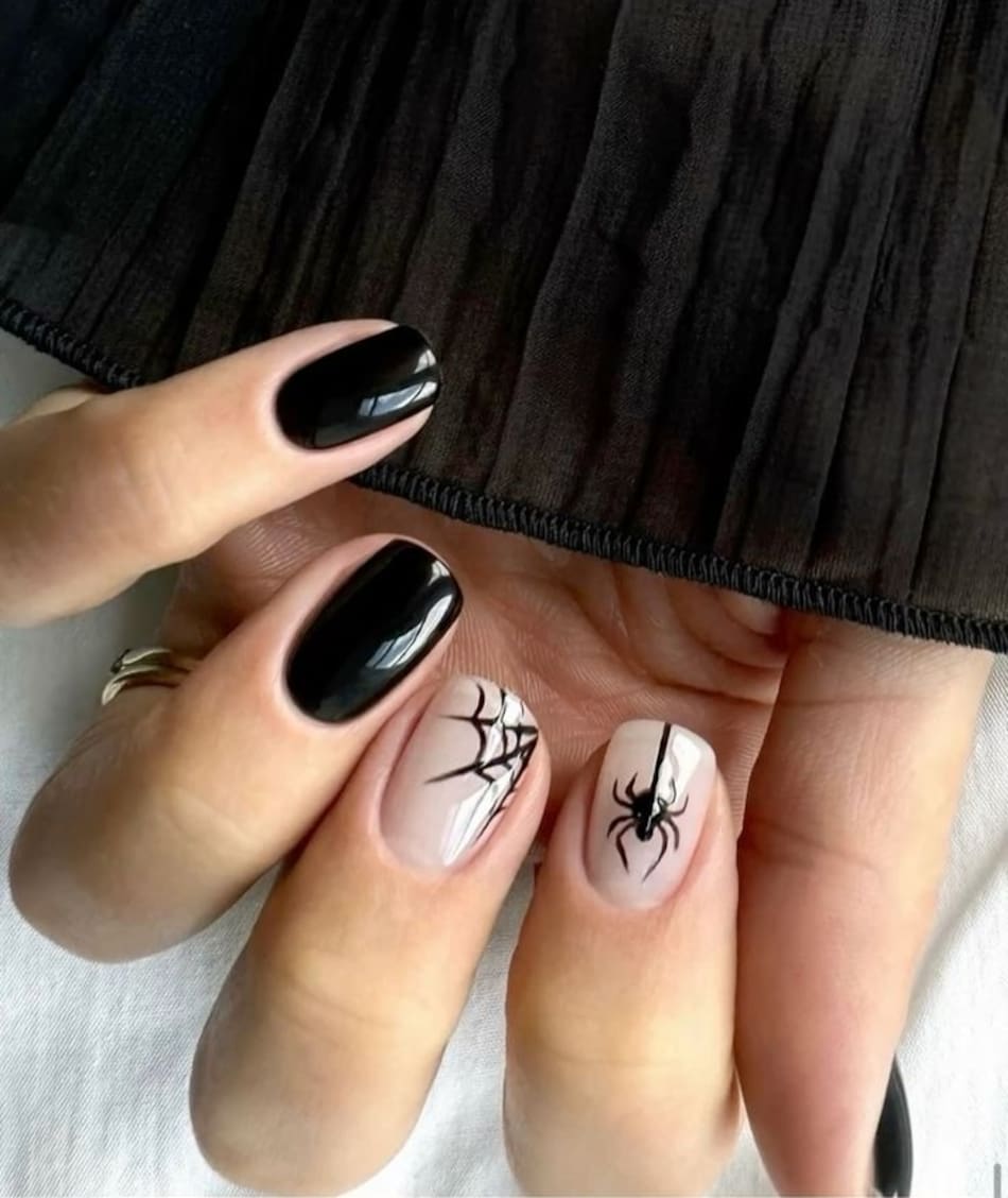 Para un diseño más dramático y detallado, las telarañas sobre fondo oscuro son ideales. La base negra o azul noche permite que las líneas blancas o plateadas de la tela de araña resalten, y pequeños detalles en blanco y negro para añadir sofisticación al diseño. Este estilo es perfecto para quienes buscan una manicura más elaborada y llamativa.