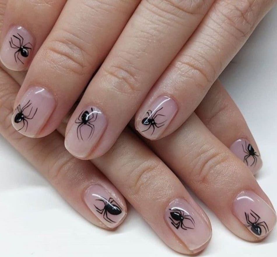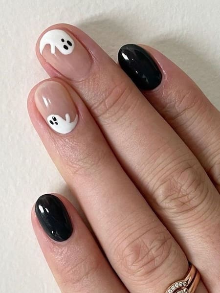 Si buscás algo más divertido. Los fantasmas son la mejor opción. Podés comenzar pintando tus uñas de color nude y luego, dibujar los pequeños fantasmas en tonos blancos con ojitos negros. Esta combinación mezcla el espíritu lúdico de Halloween con un toque chic y elegante.
