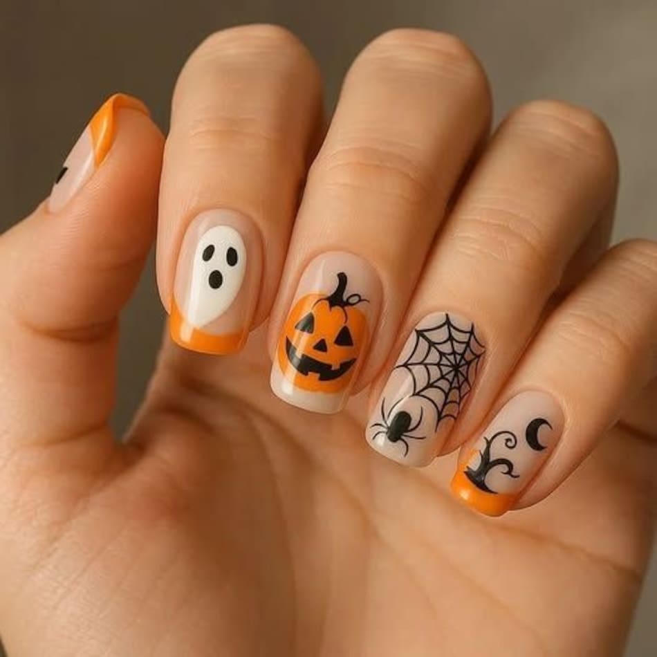 Para un look temático pero discreto, las calabazas son una opción infalible. La base puede ser transparente, nude o incluso en tonos naranjas. Allí, podés dibujar el contorno de una calabaza en negro o de color naranja, mientras que las demás se mantienen neutras o en tonos oscuros para equilibrar el diseño. Este estilo es ideal para quienes quieren un toque de Halloween sin exagerar.