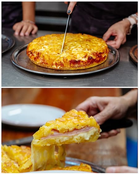 La estrella del menú es, sin dudas, la tortilla de papas rellena con jamón y queso, un clásico elevado al estatus de emblema. Se caracteriza por su toque natural y artesanal, ya que las papas son peladas y cortadas a mano y la sacan a gusto del comensal: en su punto justo, babé o bien cocida.