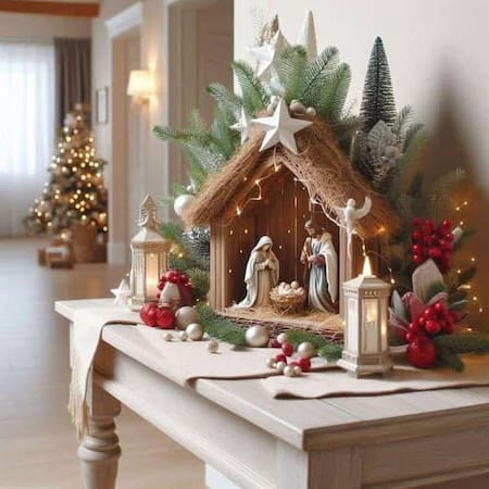 Para quienes buscan sumarse a la tendencia, crear un pesebre minimalista en casa es sencillo. Solo se necesitan figuras en tonos claros o naturales, preferentemente de madera o cerámica, y un espacio central donde puedan destacarse sin saturar la decoración. Se puede complementar con una luz cálida o una vela LED para resaltar las figuras, y agregar ramas verdes de laurel, pino o romero como toque natural. La clave está en mantener la armonía visual y la simplicidad.