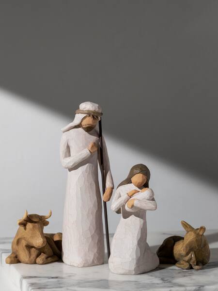 En lugar de una escena completa, se priorizan los elementos esenciales: María, José, el Niño Jesús y, a veces, una estrella o un pequeño establo. El resultado es un conjunto que se integra fácilmente con cualquier estilo de decoración (ya sea moderno, rústico o clásico) y que aporta equilibrio visual y una sensación de calma al ambiente festivo.