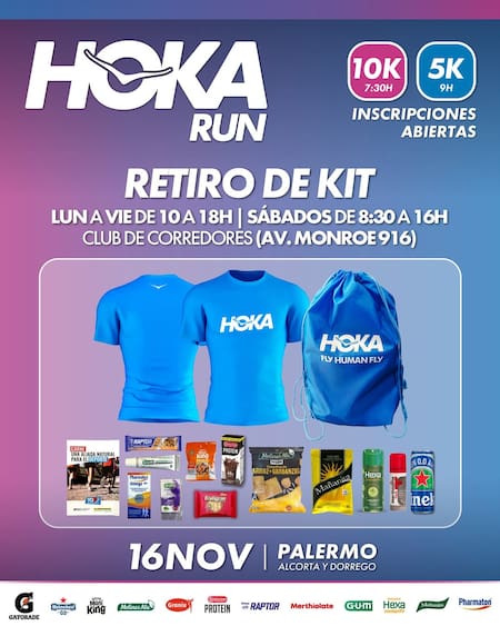 El kit de Hoka Run 2025 incluye todo lo necesario para vivir la experiencia al máximo: una remera oficial del evento color celeste, dorsal con chip, bolsa deportivo y varios regalos de los sponsors. Además, quienes completen el recorrido recibirán una medalla finisher como recuerdo de su participación.