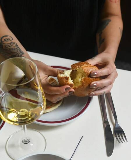 Para acompañar la charcutería, el restaurante ofrece una panera con manteca artesanal de la firma Lobos y panes de confitería Artiaga, alejándose de la omnipresencia de la masa madre y apostando por técnicas más tradicionales y refinadas.