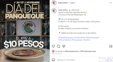 En el marco del Día del Panqueque, la cadena Lo de Carlitos, reconocida por su especialidad en panqueques y con sucursales en distintos puntos del país y del mundo, ofrecerá este postre a tan solo $10 los días 26 y 27 de noviembre.