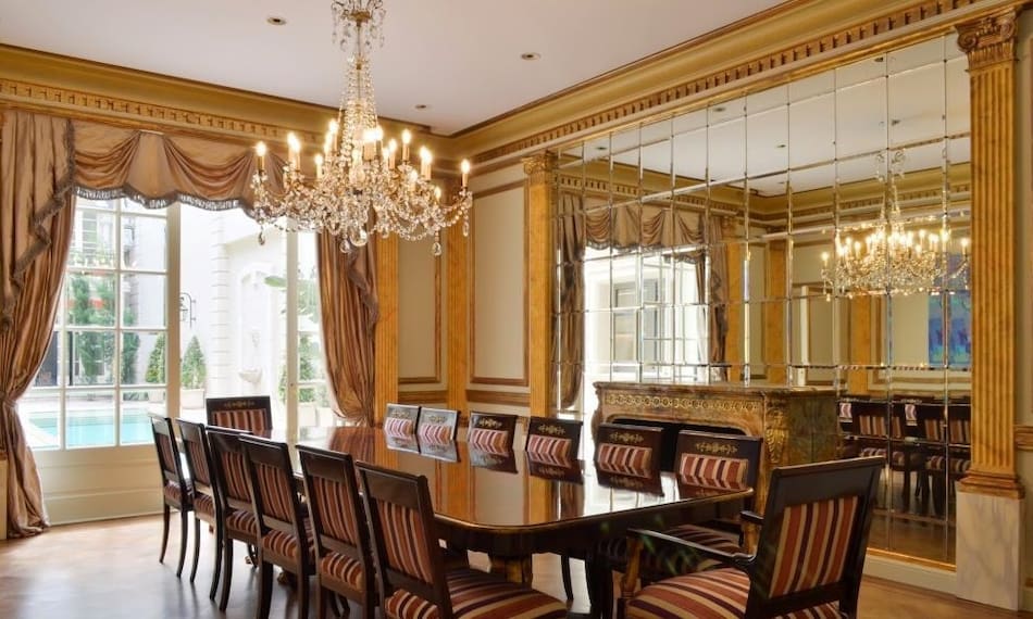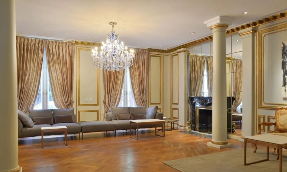 El living principal ocupa un espacio central en la planta baja, con chimenea en mármol negro, columnas decoradas, cortinados de seda automatizados y ventanales con vista al jardín interior.