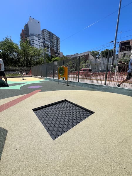 En la renovación se retiró la arena y se reemplazó por una superficie de caucho que ayuda a amortiguar las caídas. Además, se colocaron camas elásticas, hamacas y super toboganes.