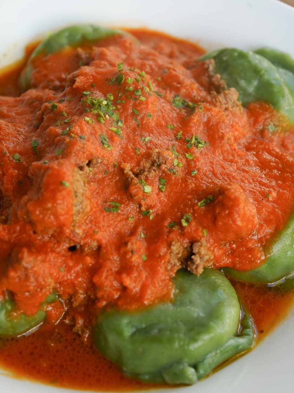 - Sorrentinos de calabaza horneada y muzzarella con masa de espinaca.