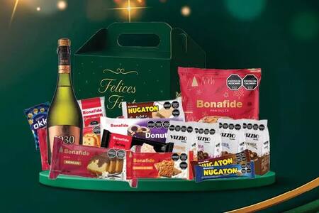 Pan dulce con chips, budín de limón, turrones, garrapiñadas, chocolates y un maletín Bonafide. Incluye un voucher de regalo por $25.000. (No incluye bebidas).