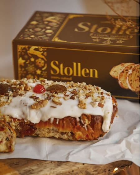 El stollen es un pan dulce de estilo alemán, con frutos secos y frutas abrillantadas, y tiene un valor de $36.000. Pero en Los Pinos también ofrecen otras variedades, como pan dulce con corazón de pastelera o con corazón de dulce de leche bañado en turrón.
