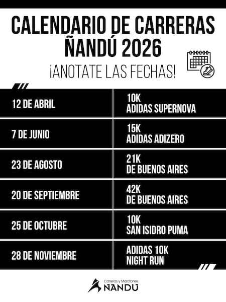 La Asociación Ñandú dio a conocer la fecha de sus carreras para el 2026 y el calendario runner empieza a tomar forma. Con pruebas icónicas como la Media Maratón y la Maratón de Buenos Aires, además de distintas carreras de 10K y 15K, la próxima temporada se perfila como una de las más convocantes, con miles de corredores listos para copar las calles a lo largo de todo el año.