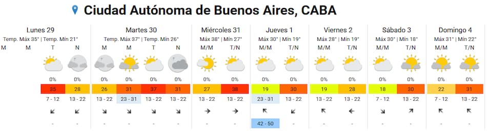 - El martes 30 se anuncia cielo algo a parcialmente nublado, vientos del noroeste rotando al oeste y los termómetros se ubicarán entre los 26 y 37 grados.