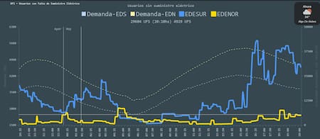 Según los registros del Ente Nacional Regulador de la Electricidad (ENRE), el momento más crítico se dio a las 16.30, cuando 45.347 usuarios estaban sin luz. De ese total, 42.957 correspondían al área atendida por Edesur y 2.390 a la de Edenor.
