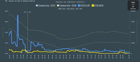 Pese a que Edesur comunicó que sus equipos trabajan arduamente y que “el suministro será restablecido en etapas”, pasadas las 20.15 de este jueves 1° de enero, se registraban 3386 usuarios sin suministro, en un contexto de alta demanda energética. A este número se suman 128 usuarios reportados por Edenor.