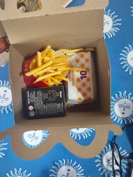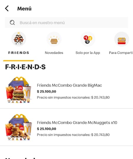 En cuanto a los comestibles, hay dos opciones: el combo Big Mac con papas fritas y gaseosa regular. Pero también se puede cambiar la hamburguesa por nuggets de pollo por un precio de $25.100 por la aplicación de local o yendo presencial.