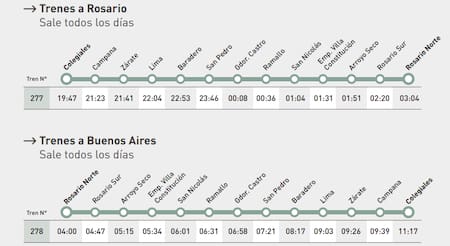 - Hacia Buenos Aires: el tren 278 saldrá de Rosario a las 04:00 y arribará a Colegiales a las 11:17.