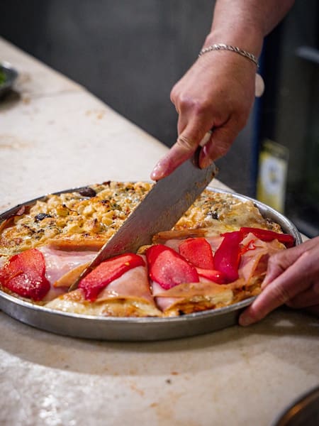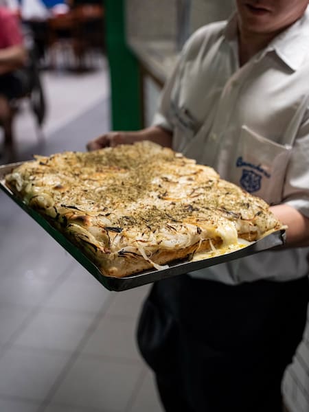 En Las Cuartetas, otro clásico infaltable de Corrientes, la muzzarella arranca en $27.000, al igual que la napolitana con muzzarella. Las pizzas completas, como la de jamón o la de matambre, se ubican en $35.000, el mismo valor que las variedades de roquefort, provolone o calabresa. Entre las opciones más elaboradas se destacan la Súper Nápoles, con muzzarella, tomate, cebolla y longaniza, a $38.000, y la Súper Cuartetas —con tomate, muzzarella, jamón, morrones y atún— que llega a los $48.000.