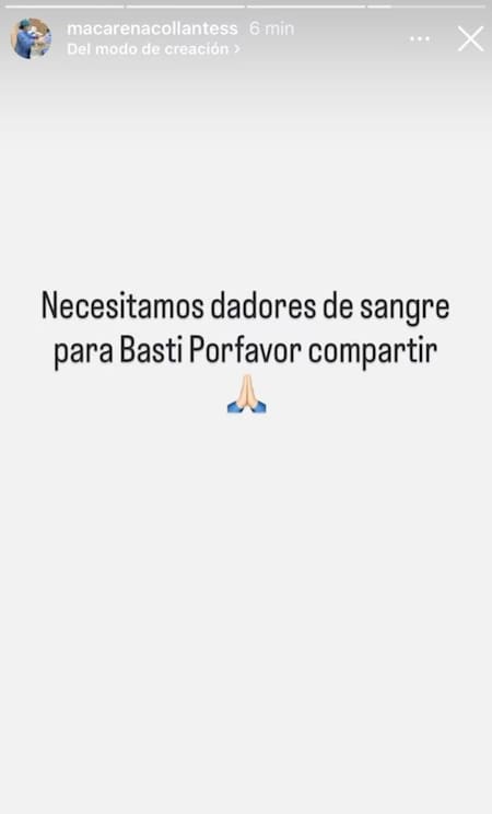 Este martes Macarena, la madre de Bastian, pidió dadores de sangre con un posteo en Instagram.
