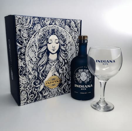 La caja para regalar contiene un estuche ilustrado de lujo, una botella de 750 ml y una copa de gin grabada con el logo de Indiana.