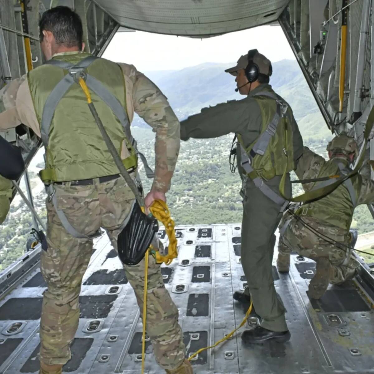 Según lo informado con carácter oficial, durante el ejercicio de aerocooperación se completaron más de 600 lanzamientos, tanto de apertura automática como manual. La Fuerza Aérea desplegó un avión C-130H Hércules y sumó la participación de efectivos del Grupo de Operaciones Especiales, además de personal y medios de la Escuela de Aviación Militar, habitual zona de embarque cuando los saltos se realizan en el sector conocido como La Mezquita.