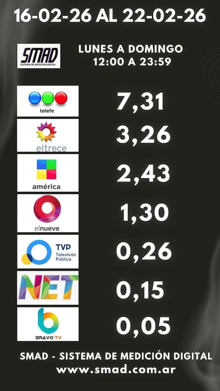 Telefe sostuvo su liderazgo por sobre El Trece, que se ubicó en el segundo puesto con 3,26. El tercer lugar fue para América con 2,43 y le siguieron Canal 9 (1,30), TV Pública (0,26), NET TV (0,15) y Bravo (0,05).