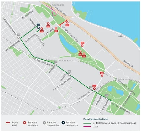 - Línea 130: su ramal habitual por los Bosques de Palermo dejará de utilizar el tramo Pampa–Lugones–Dorrego y pasará a circular por la avenida Del Libertador.