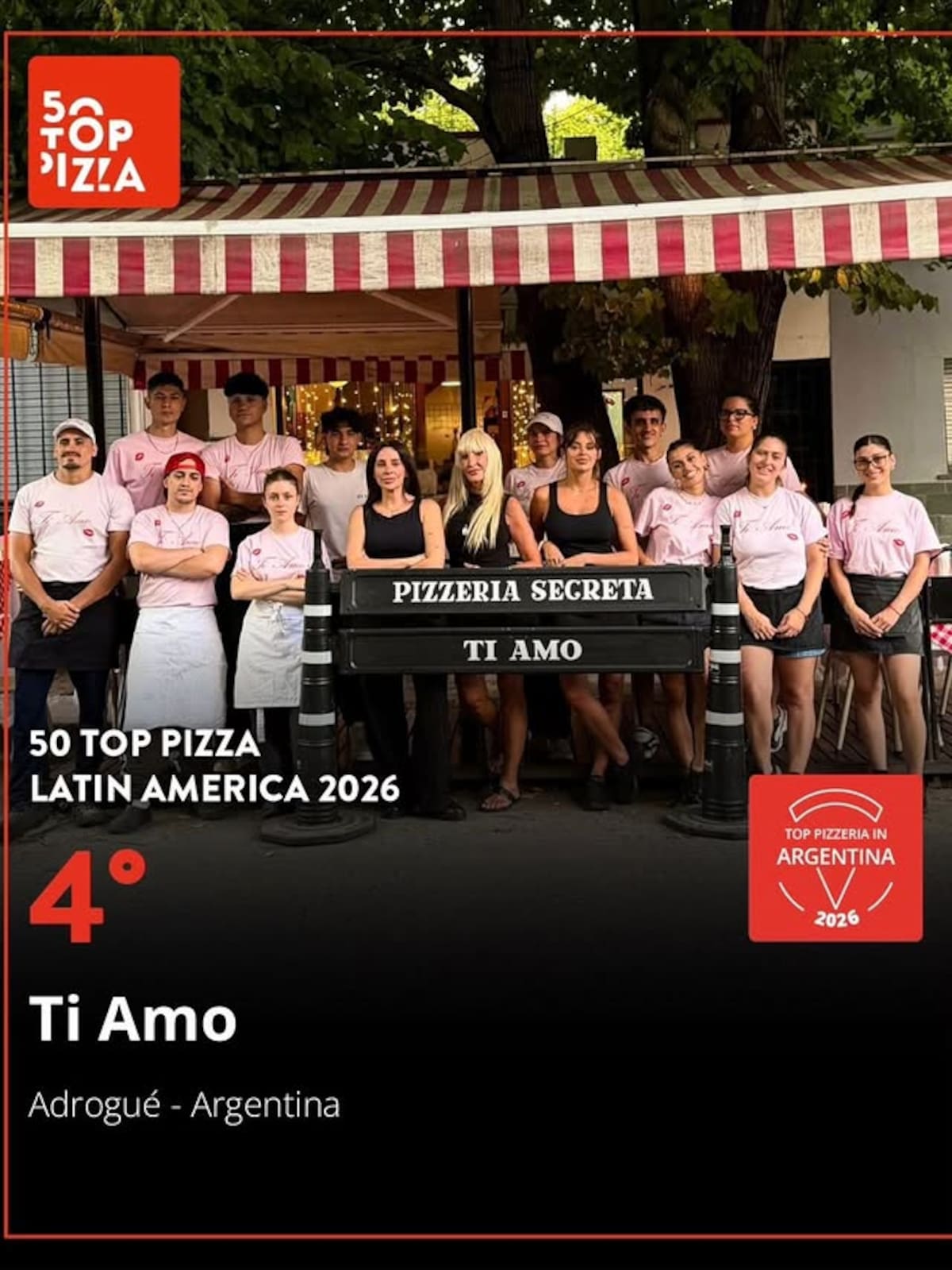 Ubicada en Diagonal toll 1420, pleno centro de Adrogué, Ti Amo es descripta por 50 Top Pizza como una “pizzería alegre, acogedora y confortable con una encantadora terraza al aire libre”. Las hermanas Santoro atravesaron la pandemia de Covid-19 con éxito, logrando “un éxito inmediato gracias a la calidad de su pizza, un estilo napolitano contemporáneo y el equilibrio perfecto entre calidad y precio”.