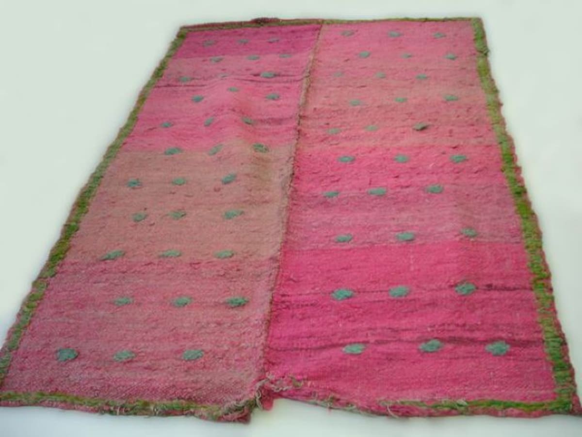 Esta frazada es de lana teñida de color rosa fuerte con los bordes y decoraciones de color verde. Por sus puntos se puede ver que fue tejida en un telar.
