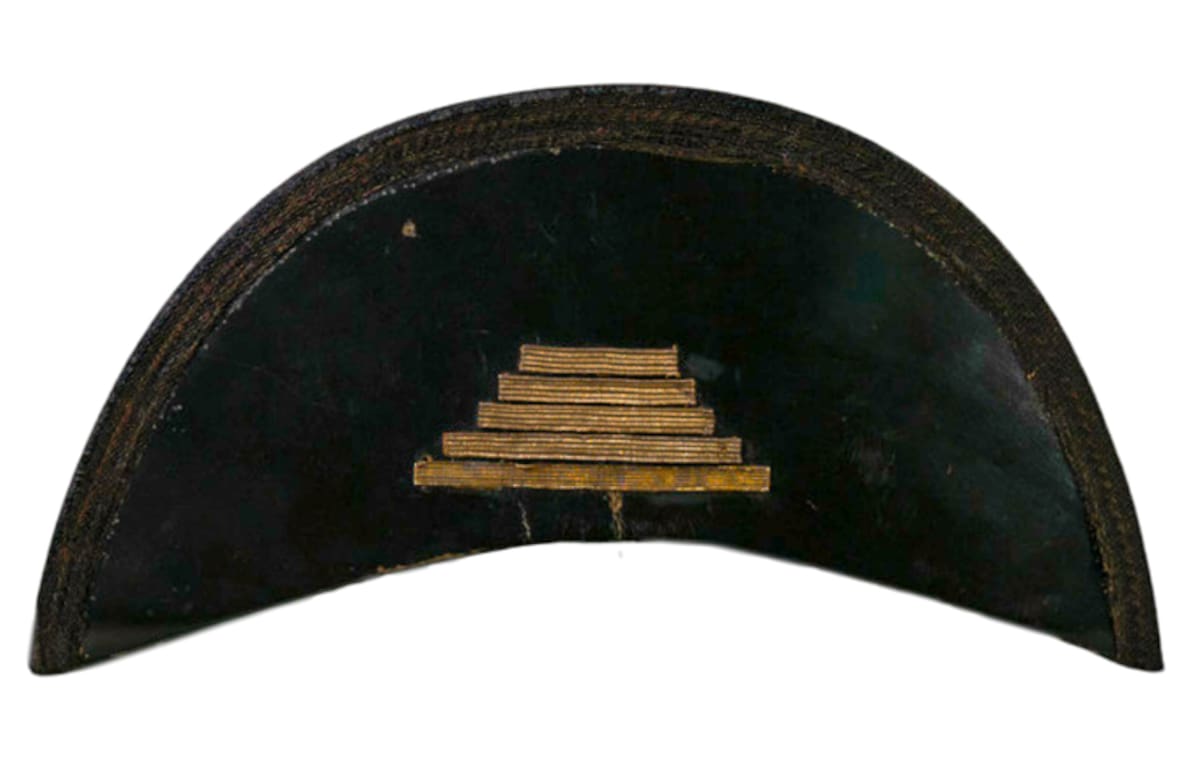 Este sombrero llamado “falucho” era común entre jefes militares. Generalmente, eran coloridos y tenían adornos de plumas, algunos eran más simples y rígidos, como este de color negro del General.
