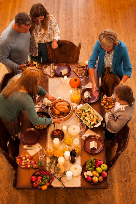 En este día, las familias comparten una comida especial que tiene como protagonista al pavo asado. El menú tradicional suele incluir otros platos como el famoso relleno de pan, hierbas y vegetales; puré de papas con salsa gravy; salsa de arándanos; batatas dulces y el pastel de calabaza o de manzana.