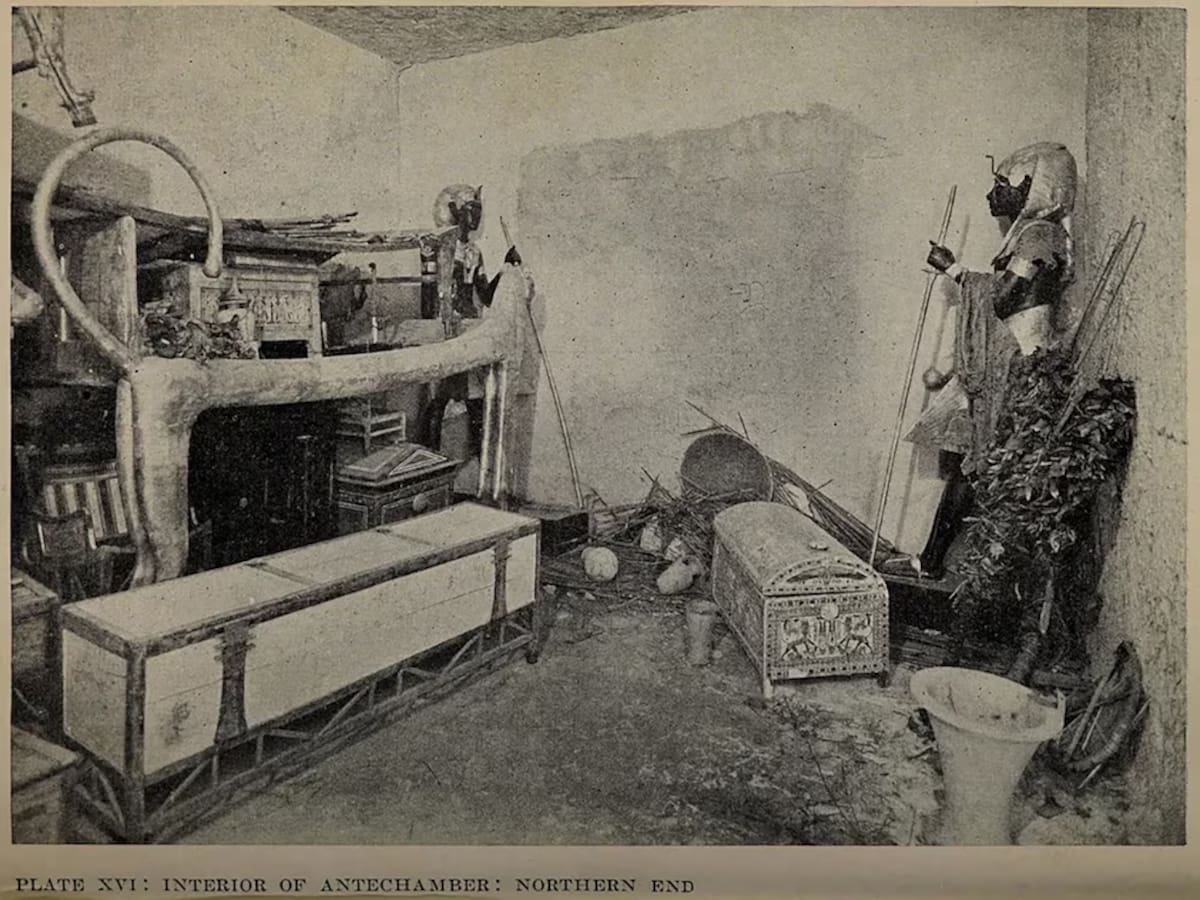 El 26 de noviembre, Carter, Carnarvon, Evelyn y el ayudante del arqueólogo, Arthur Callender, miraron el interior a través de una pequeña abertura y la abrieron al día siguiente, porque no podían hacerlo sin la presencia de un inspector del gobierno egipcio. Había cofres, tronos, altares y divanes, hasta sumar cerca de cinco mil objetos.