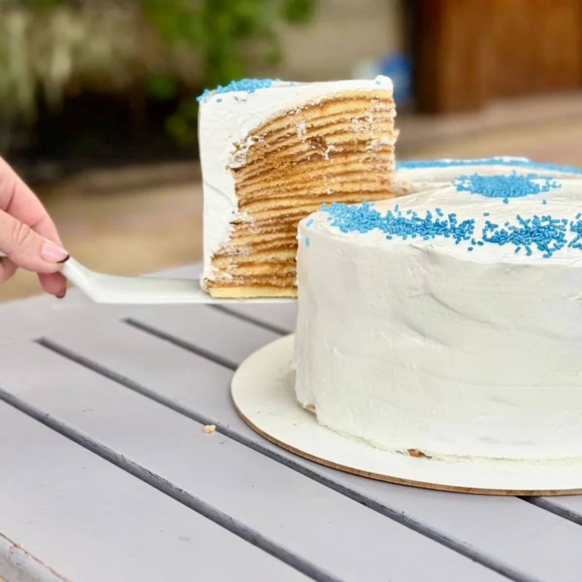 Para unas Fiestas Patrias de 25 de mayo, realizaron el original pastel, con moldes redondos hechos de aluminio. Hecha de capas muy finas -25 por la fecha Patria, untadas con dulce de leche. Ellas vendieron su producción artesanal en porciones, en la Plaza Cast y por las calles de la ciudad, portándolas con gracia y elegancia en canastos sobre sus cabezas, de cabellos azabache, recogidos bien tirantes.