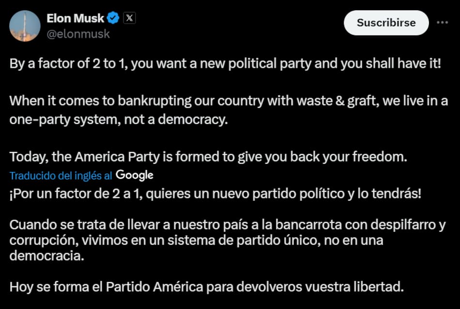 “Por un factor de 2 a 1, ustedes quieren un nuevo partido político y ustedes deberían tenerlo. En lo que se refiere a llevar a la bancarrota a nuestro país con despilfarro y corrupción, vivimos en un sistema de un partido, no una democracia. Hoy, se ha formado en America Party para devolverles su libertad”, dijo el magnate sudafricano en X.