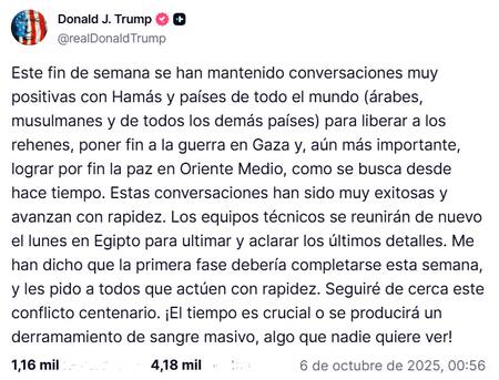 “Este fin de semana se han mantenido conversaciones muy positivas con Hamás y países de todo el mundo (árabes, musulmanes y de todos los demás países) para liberar a los rehenes, poner fin a la guerra en Gaza y, aún más importante, lograr por fin la paz en Oriente Medio, como se busca desde hace tiempo”, insistió el mandatario.