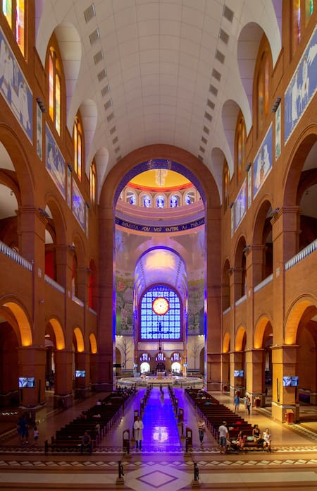El interior de la Basílica de Nuestra Señora Aparecida armoniza elementos arquitectónicos y artísticos que expresan la espiritualidad y la identidad cultural de Brasil. Los visitantes pueden contemplar mosaicos de gran valor estético, vitrales de intensos colores y un ambiente en el que se entrelazan el recogimiento y la grandeza. En el altar mayor se conserva una réplica exacta de la imagen original de la Virgen Aparecida, protegida en un nicho dorado que concentra la devoción de los fieles.