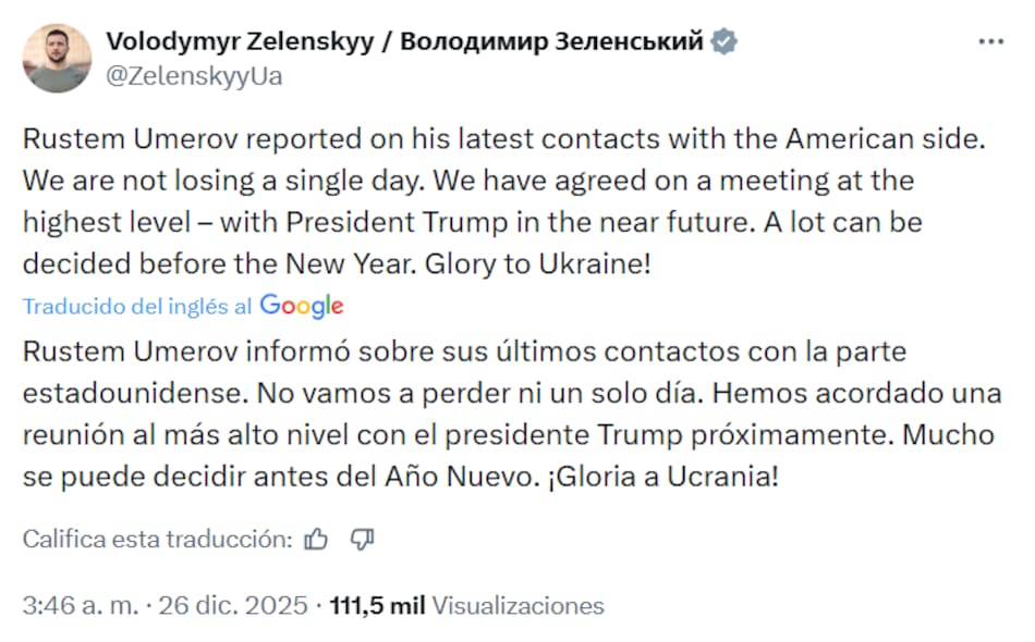 Zelensky publicó el 26 de diciembre en X este comunicado sobre la reunión con Trump y el avance de negociaciones con Rusia. “Hemos acordado una reunión al más alto nivel con el presidente Trump en el futuro cercano. Mucho puede decidirse antes de fin de año. ¡Gloria a Ucrania!“, cerró el mensaje.