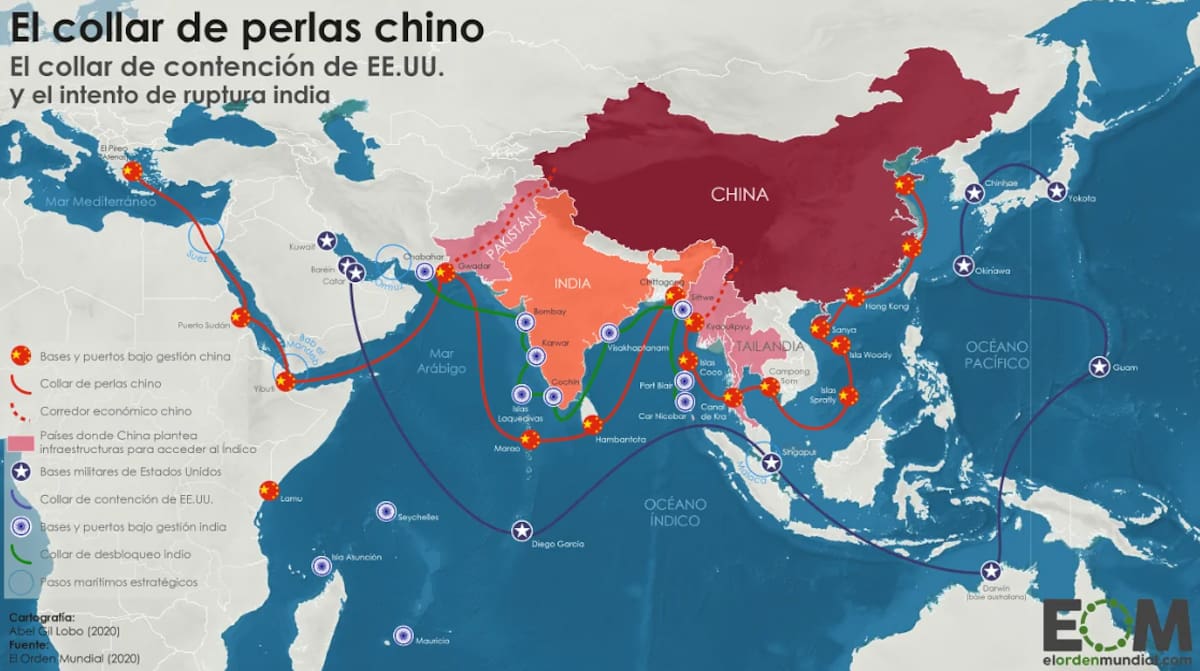 Se trata de una red de puertos, bases militares, alianzas diplomáticas e inversiones que bordea el océano Índico y se extiende hacia África oriental, con el propósito de asegurar las rutas marítimas indispensables para su economía y proyectar su influencia a escala global.