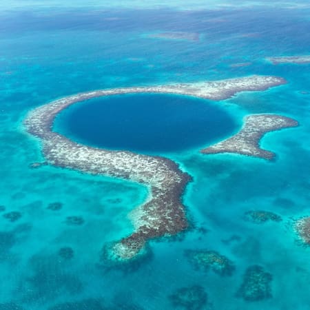 Los llamados agujeros azules son formaciones naturales que se originaron a lo largo de miles de años, cuando cavernas de piedra caliza colapsaron y quedaron inundadas por el mar. Su color azul intenso se debe a la profundidad y a la forma en que la luz se absorbe en su interior, generando un contraste visual impactante desde la superficie.