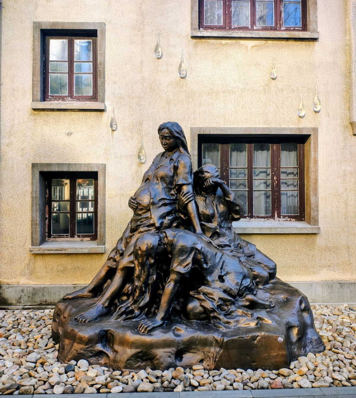 Al ingresar, lo primero que vemos es un monumento de tres mujeres agobiadas, una de ellas embarazada. Del edificio que está detrás de la estatua caen lágrimas. La obra está basada en una famosa fotografía tomada por un miembro del 164 Cuerpo Fotográfico y de Telecomunicaciones del Ejército de los Estados Unidos el 3 de septiembre de 1944 en Songshan (provincia de Yunnan). Como las mujeres estaban con los soldados japoneses, fueron trasladadas por el Guomindang a un campo de prisioneros donde permanecieron durante algunos meses. La mujer embarazada era Park Young-shim y hacía 5 años que la habían esclavizado sexualmente.