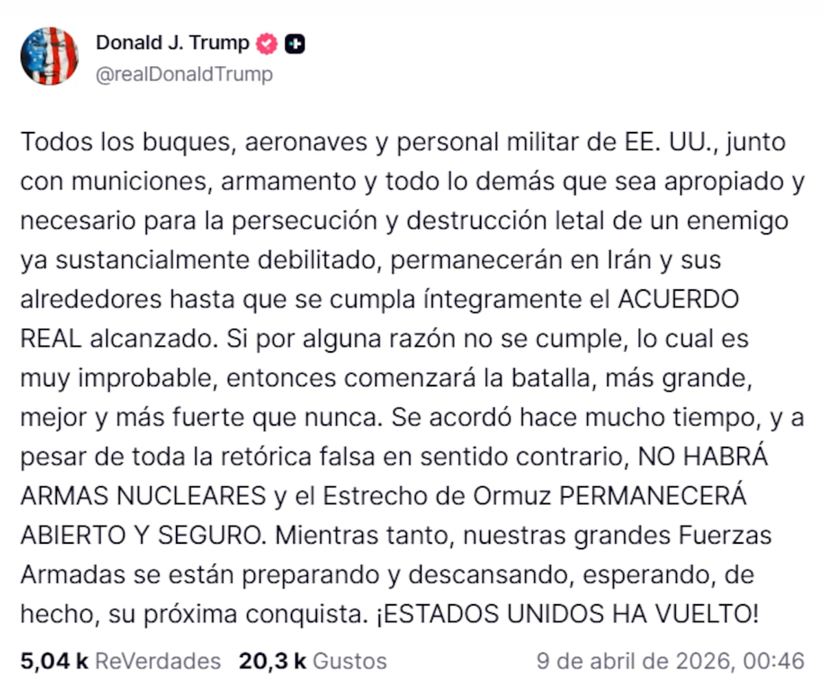 “Todos los buques, aeronaves y personal militar de EE. UU., junto con municiones, armamento y todo lo demás que sea apropiado y necesario para la persecución y destrucción letal de un enemigo ya sustancialmente debilitado, permanecerán en Irán y sus alrededores hasta que se cumpla íntegramente el acuerdo real alcanzado”, afirmó Trump.