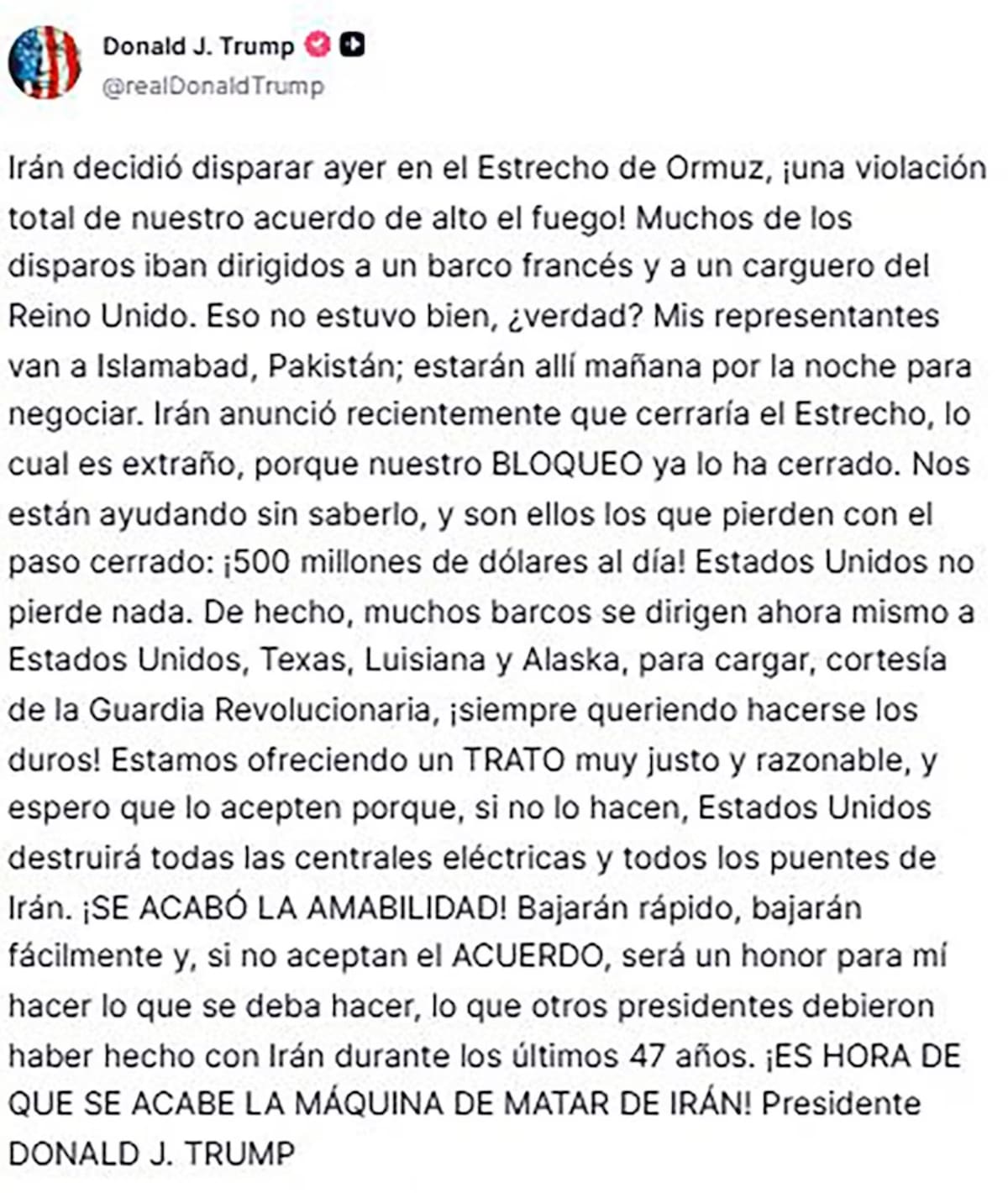 Según expresó Trump, Irán habría disparado contra embarcaciones internacionales, incluyendo un buque francés y un carguero del Reino Unido, lo que calificó como una “violación total” del acuerdo vigente. Además, sostuvo que representantes estadounidenses viajarán a Islamabad, en Pakistán, para continuar las negociaciones diplomáticas en busca de una salida al conflicto.