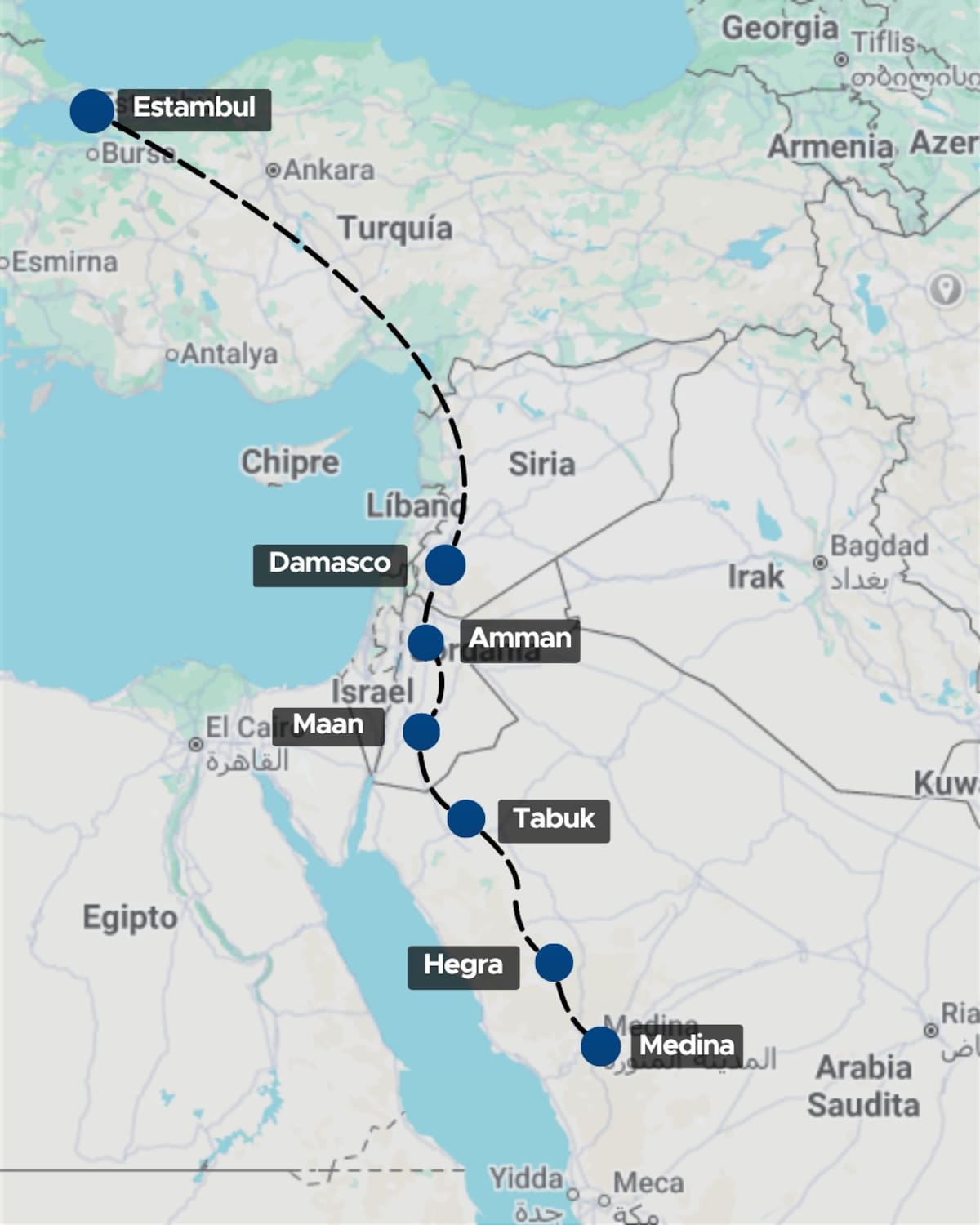 La ruta comercial vía ferrocarril surge desde la ciudad saudí de Medina, pasa por Maan y Amaan en Jordania, Damasco en Siria, y finaliza su recorrido en Estambul, Turquía. Con este anuncio, el comercio entre estos cuatro países se verá ampliamente beneficiado, logrando mucha más conectividad.