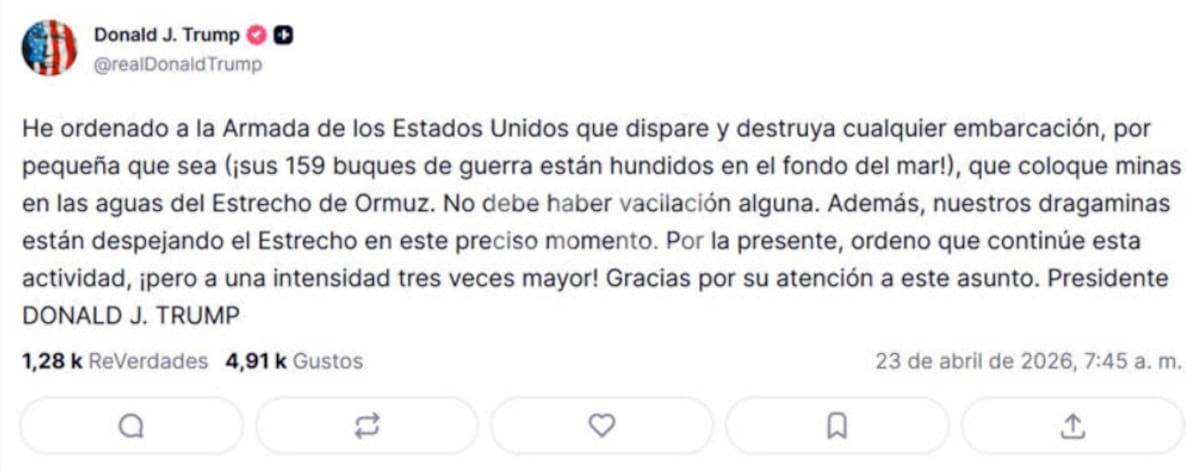 “He ordenado a la Armada de los Estados Unidos que dispare y destruya cualquier embarcación, por pequeña que sea, que coloque minas en las aguas del Estrecho de Ormuz. No debe haber vacilación alguna. Además, nuestros dragaminas están despejando el Estrecho en este preciso momento. Por la presente, ordeno que continúe esta actividad, ¡pero a una intensidad tres veces mayor! Gracias por su atención a este asunto", publicó.