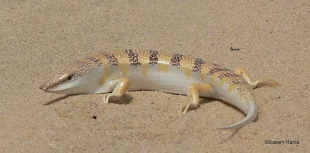 Este lagarto de unos 20 centímetros de largo pertenece a la familia de los escíncidos y evolucionó de manera única para sobrevivir en el desierto. Su cuerpo alargado, robusto y de aspecto cilíndrico, junto con sus patas cortas pero potentes y una cola musculosa, le permiten moverse con gran velocidad entre los granos de arena, utilizando un movimiento ondulante similar al de una serpiente.